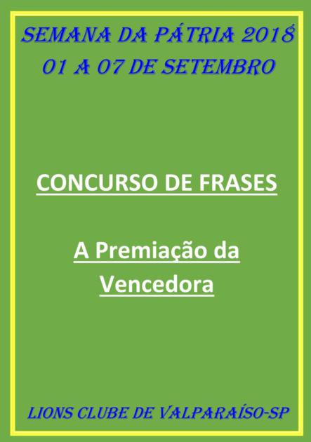 O Comitê de Educação e Civismo, organizou o CONCURSO DE FRASES alusivas a Semana da Pátria, entre os alunos de 8° e 9° ano das seguintes Escolas Parceiras, públicas e particulares, de Valparaíso-SP: E.E.Vicente Barbosa, E.E.Arlinda Pessoa Morbeck, E.E.Prof.David Golia, Colégio Royal Objetivo e Colégio Geração Valparaiso (GV).